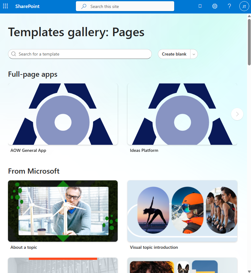 The other way to create a SharePoint page is from the SharePoint home page. Click +New near the top middle of the home screen. Select Page. If you do not see this option, or you click it and don't see the option for a "full-page app" you can try the URL at https://[tenant].sharepoint.com/sites/[my_sharepoint]/_layouts/15/createpagefromtemplate.aspx. Under the Full-page apps section select the web part to use on the new page. This "full-page app" makes it so only a single web part can be used on a SharePoint page. We recommend this way so there will be no other web parts on the page. Board Hub is designed to take up the entire contents of your page. This also prevents you from adding the web part multiple times on a page, which can result in errors.