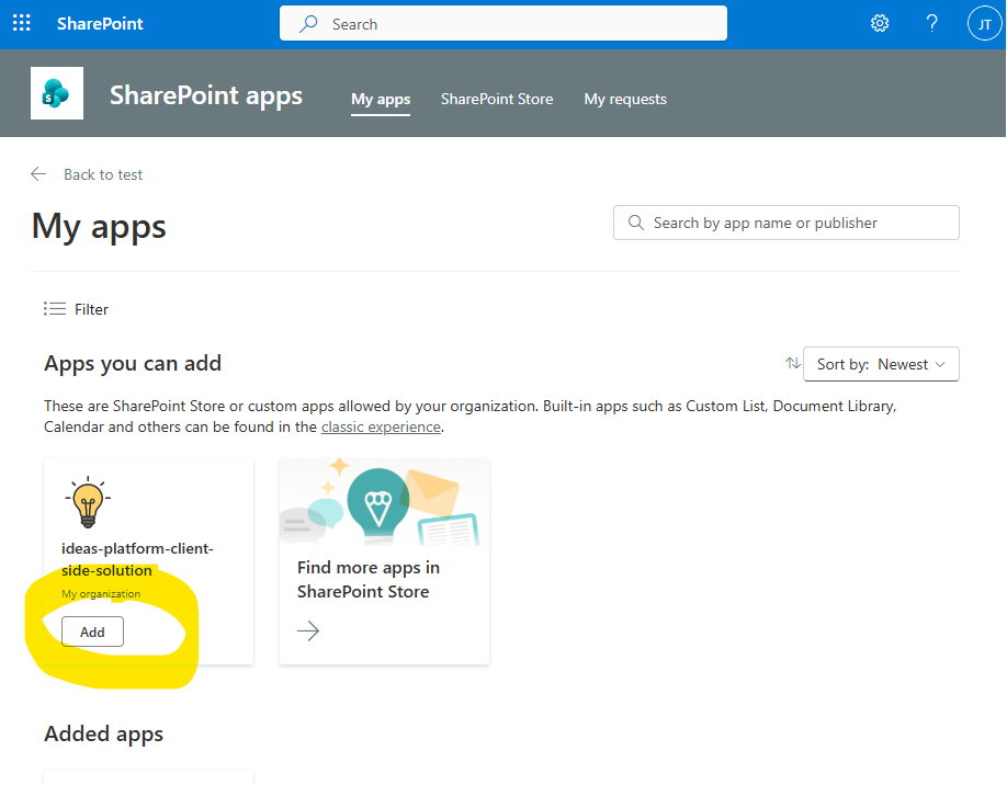 Once the web part is installed by your SharePoint admin, if they did not install the web part for the entire tenant, an owner of your SharePoint site must make it available to use. A SharePoint owner can do this at the home page of your SharePoint. Click on +New > App. The "My apps" page is shown below. The new web part should be listed under "Apps you can add". Click "Add" to add it. If you do not see it listed, look under the "Added apps" section in case it was already added.