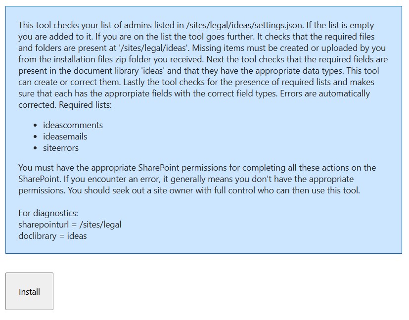 Click Install. It will set up everything for you. It creates the supporting SharePoint lists and adds the correct data columns for the document library and lists. It takes a few seconds to run, but in the end you should see a success message and a link to go to the Admin page to finish setting things up as you would like.