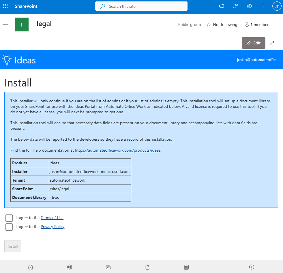 The page explains how installation will go. It will create the document library indicated if not already created. It will set up all necessary data fields in the document library. And it will create associated lists. The five data points will be reported to Automate Office Work so we have a record of the installation. You must agree to the Terms of Use and Privacy Policy in order to go forward. You should see comments on your screen as the installation proceeds. If there is an error you must correct the error. Once installation is successful, you are directed to the home screen.