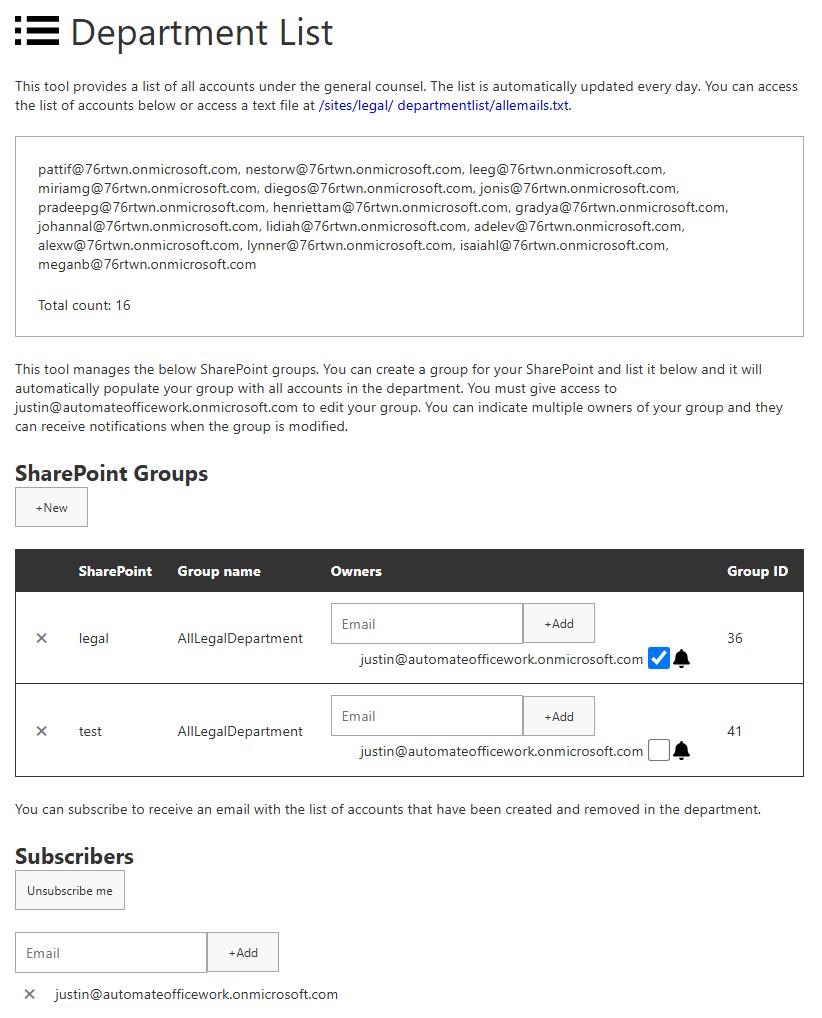 Next you need a page where people can input the URL of their SharePoint and the group that they want updated. You can also capture their email address to record them as the owner and give them the option to be notified when their group is changed and to see what the changes were.