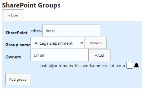 And here's the input form when the user clicks on +New. The user puts in the URL of their SharePoint and the drop-down menu fills in with available groups. The user can select which one they want and we capture the group ID number. By default the person is an owner and they can add other owners. And indicate whether they want to be notified of changes.