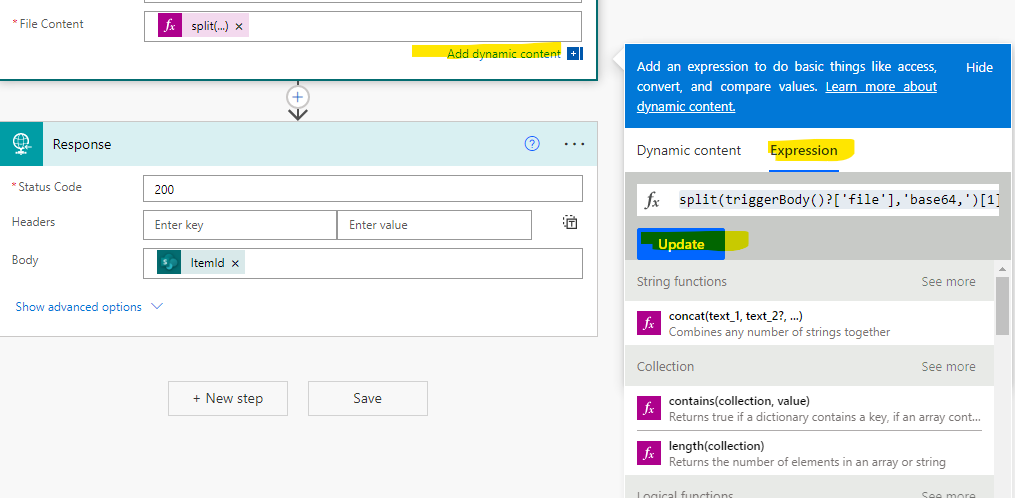 If you need any help with creating this flow yourself, you should see the previous article where we teach you how to start a Power Automate flow, set up the trigger and prepare it to receive variables and then how to use those variable in the flow. The only thing new here is that we need to massage the data we already received by using an expression. To create an expression, just click in the text box and click "Add dynamic content". Then click the "Expression" tab. In the expression function box type or paste the function I gave you and click the "Update" button. Sometimes Power Automate notifies you about an error. Just click OK and click the "Update" button again. It sometimes says there is an error when there is no error. Save your flow and now your users can upload files to your SharePoint document library.